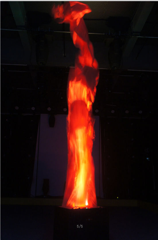 Perfect for large events and stages, custom built into a self contained roadcase on castors for touring, our XL sized fame flames are an inspiring effect that will dramatically liven up any stage The flame effect is produced by illuminating from below a huge 6 metre flame shaped silk which is blown upwards and pulsated by a powerful fan. The units can ‘burn’ all night and have the ability to select various colours or colour changing effects controlled manually or via DMX.